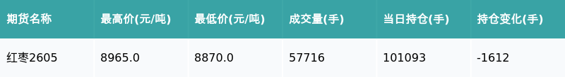 南财智讯3月25日电,盘后期货数据显示,郑州商品交易所的红枣主力合约收跌0.34%,收盘报8890.0元/吨,日内资金流出1613.28万元。其他相关指标见下表: