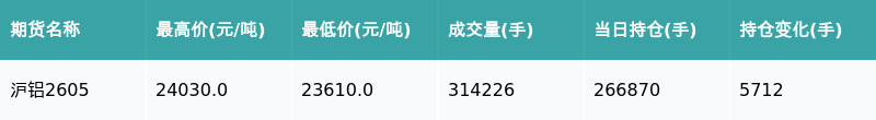 南财智讯3月25日电,盘后期货数据显示,上海期货交易所的沪铝主力合约收涨0.63%,收盘报23860.0元/吨,日内资金流入2.37亿元。其他相关指标见下表: