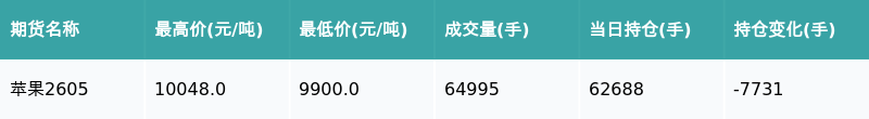 南财智讯3月25日电,盘后期货数据显示,郑州商品交易所的苹果主力合约收跌0.21%,收盘报9978.0元/吨,日内资金流出2.51亿元。其他相关指标见下表: